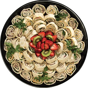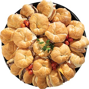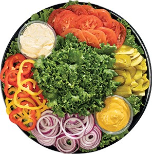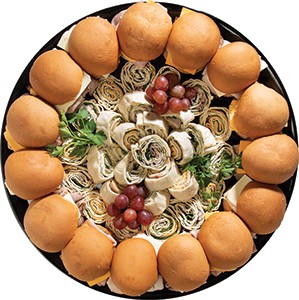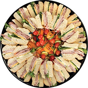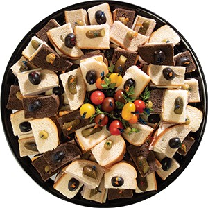 <p>Ham, turkey, roast beef, Swiss cheese, American cheese, Colby Jack cheese, butter bread, seedless rye, dark pumpernickel, rainbow cherry tomatoes, whole black olives, stuffed green olives, and small gherkins.</p>