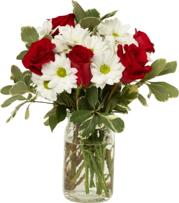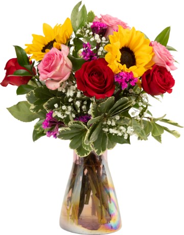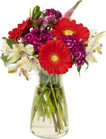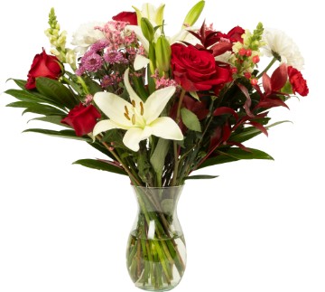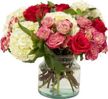 This stunning bouquet of hydrangea, red roses, poms, mini carnations, and mixed fillers combines a harmonious mix of colors and textures, creating a sophisticated yet vibrant display. Vase Not Included